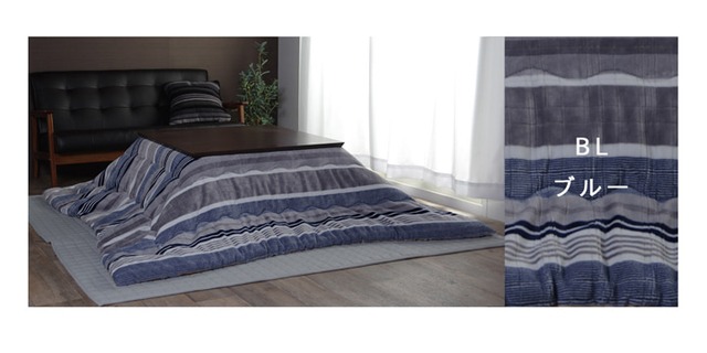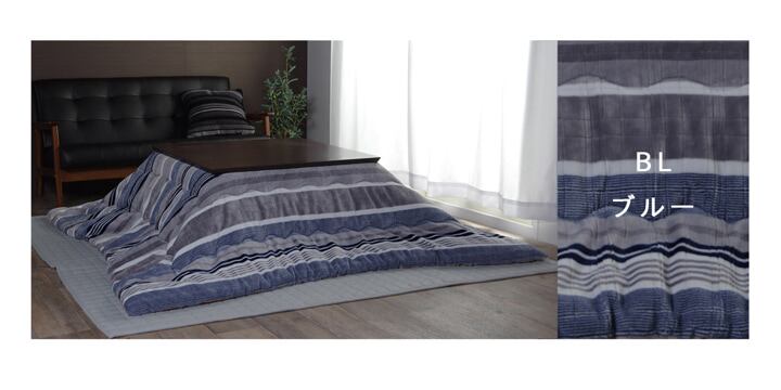 ジャガード織の凹凸感が特徴的な素材感があるこたつ布団です。お部屋の雰囲気気を崩さない淡い色目とカジュアルでお部屋に合いやすいストライプ柄にしました。薄手なので折りたたんでもかさばらず、コンパクトに収納できます。部分暖房のコタツは電気代もおトクです。