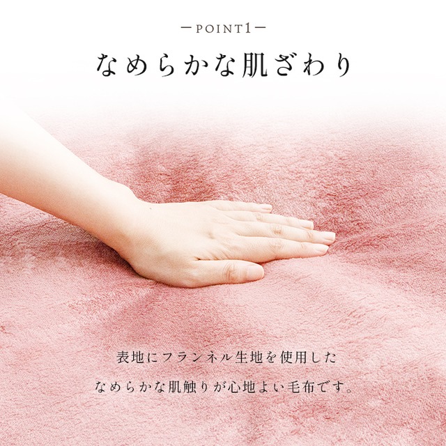表地にフランネル生地を使用した、なめらかな肌触りが心地よい毛布です。