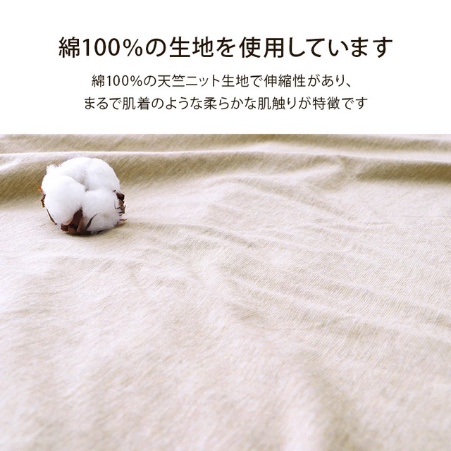 綿100%の天竺ニット生地で伸縮性があり、まるで肌着のような柔らかな肌触りが特徴です。