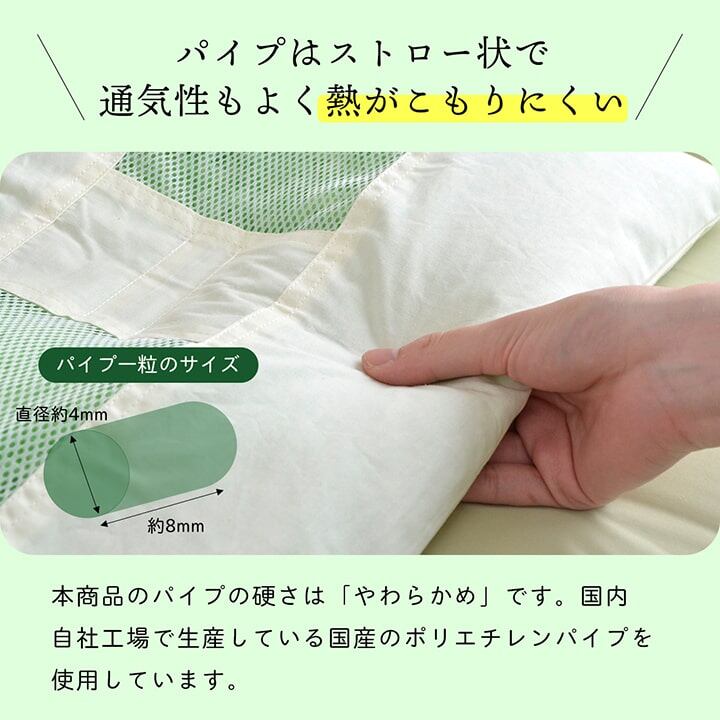 ヒバエッセンス練り込みパイプを使用しています。青森県のヒバの木から抽出した「ヒバエッセンス」をメーカー独自の技術でパイプに加工しました。ヒバエッセンスにはヒノキチオールという、天然物質では極めて抗菌性の高い成分が含まれています。(無加工品に比べ、抗菌・防臭効果があります。)ヒバエッセンスで安らかな森の眠りをご提案します。パイプ使用のため、通気性がよく、熱がこもらず心地よくご使用できます。ファスナー式で中材(パイプ)の交換、高さ(量)の調節が可能です。ご家庭で簡単にパイプが洗えます。