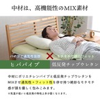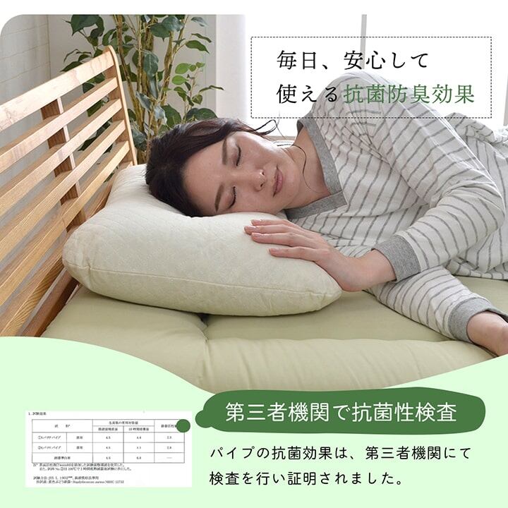 寝装品に求められる機能満載のオリジナル寝具シリーズの枕です。中材のポリエチレンパイプに「ヒバエッセンス」を加工しています。青森のヒバの木から抽出されるヒバエッセンスには、ヒノキチオールという天然物質として極めて「抗菌性」の高い成分が含まれ、医療・食品など多分野で利用研究が進められています。中材に低反発チップとポリエチレンパイプをMIXさせパイプの通気性と低反発チップのフィット性を併せ持つ絶妙なモチモチ感が頭を優しく包みこみます。ポリエチレンパイプは国内自社工場で生産している国産のポリエチレンパイプを使用しています。