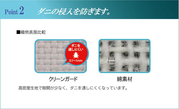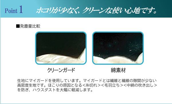生地にマイガードを使用しています。マイガードは繊維と繊維の隙間が少ない高密度生地なので、ほこりの原因となる糸切れ、毛羽立ち、中綿の吹き出しを防ぎハウスダストを大幅に低減します。またダニの侵入を防ぎ、クリーンで快適な睡眠をサポートします。