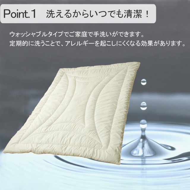 体にフィットしやすいこだわりの「フィットキルト加工」で、隙間ができにくく、熱を逃がしにくい掛け布団です。また、中材に使用しています「フィルハーモニー」は、①抗菌防臭性②防ダニ性の2点に優れており、清潔で快適な睡眠ができます。