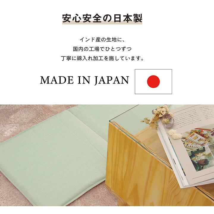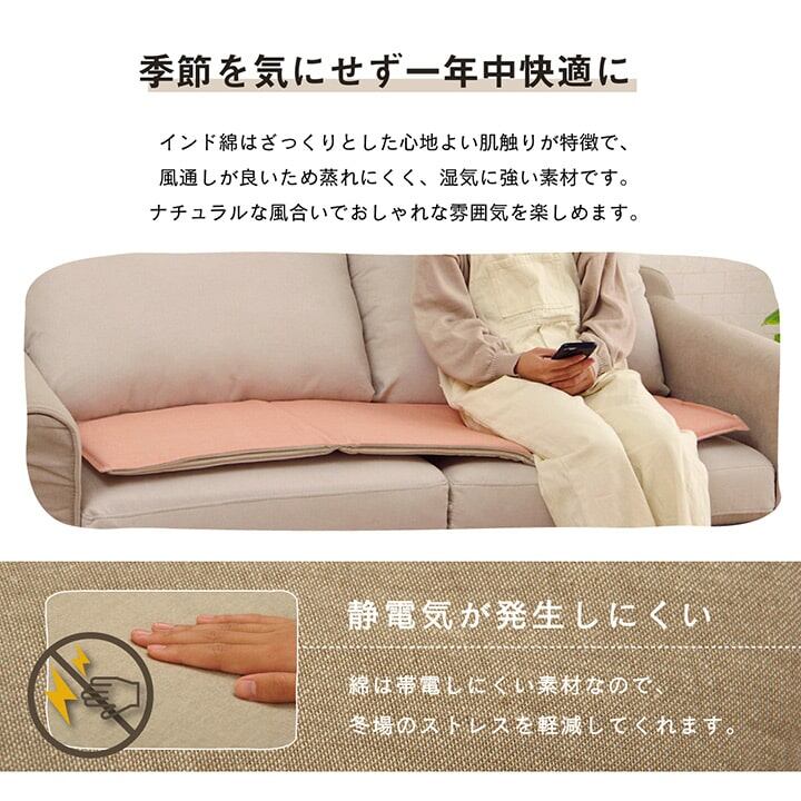 安心の日本製です。インド綿100%のオーガニックコットンを使用し、ざっくりとした肌触りが特徴です。シンプルで飽きの来ないデザインです。ソファの汚れ防止やクッション性のアップに、また車のリアシートとしても最適です。季節を問わずご使用いただけます。