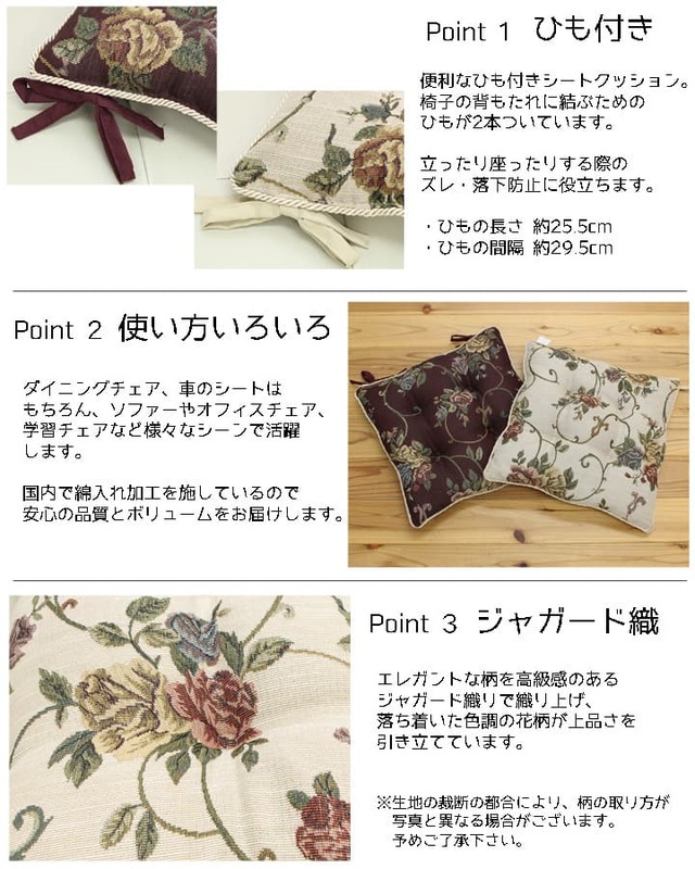 エレガンス柄のクッションです。人気の柄で洋室にもぴったりの商品です。表地にはジャガード織の生地を使用しているため上品な風合いのある商品です。