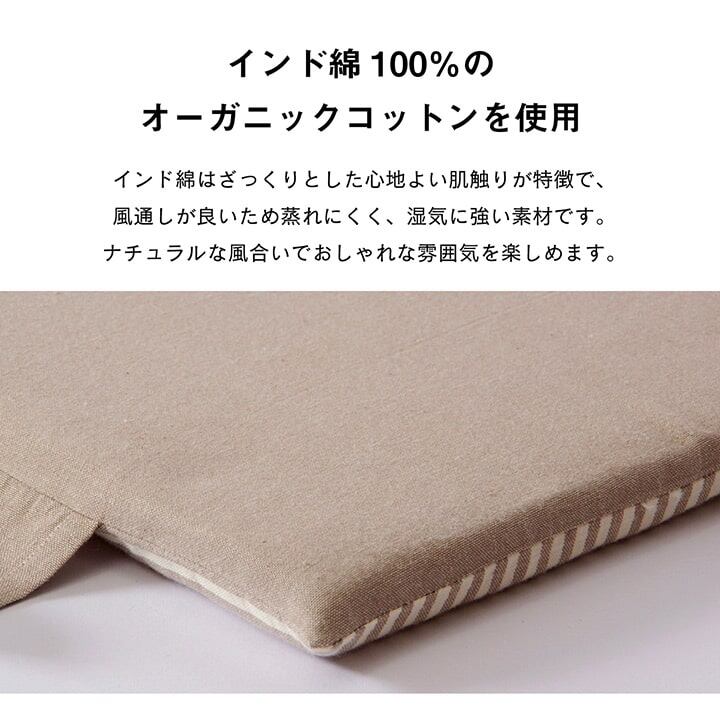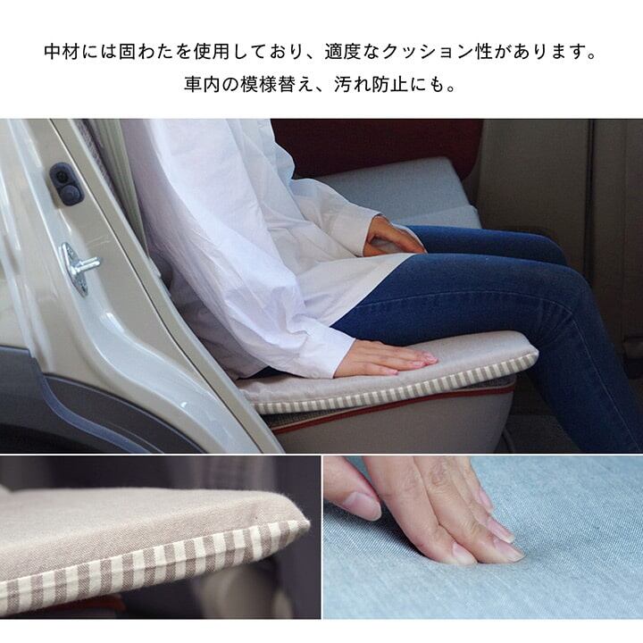 シンプルなデザインのカークッションです。 インド綿100%のオーガニックコットンを使用し、ざっくりとした肌触りが特徴です。 中材には固わたを使用しておりますので適度なクッション性があります。