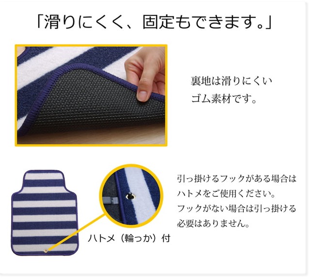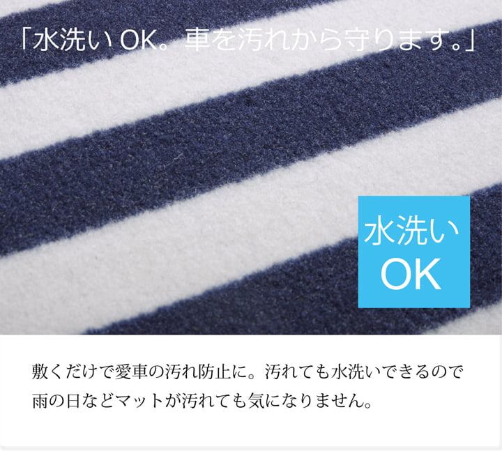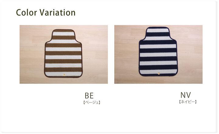 シンプルなボーダー柄をネイビーとベージュのベーシックな色で仕上げたフロント(運転席・助手席用)足元用マットです。シンプル・ベーシックをコンセプトにデザインしました。性別を問わず、また幅広い年齢の方にお使い頂ける商品です。表地には摩耗に非常に強く、耐久性のあるナイロンを使用しています。ナイロンには汚れが落ちやすく、速乾性に優れるという特長もあります。汚れても水洗い可能です。裏面にはサーモプラスチックラバーと呼ばれる素材を使用しています。滑りにくく、耐久性が高くボロボロになりくいのが特長です。※お車のペダルの形状をご確認下さい。アクセルペダルがオルガン式(床からペダルが支えられているタイプ)のお車には使用できません。