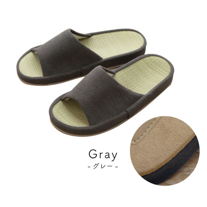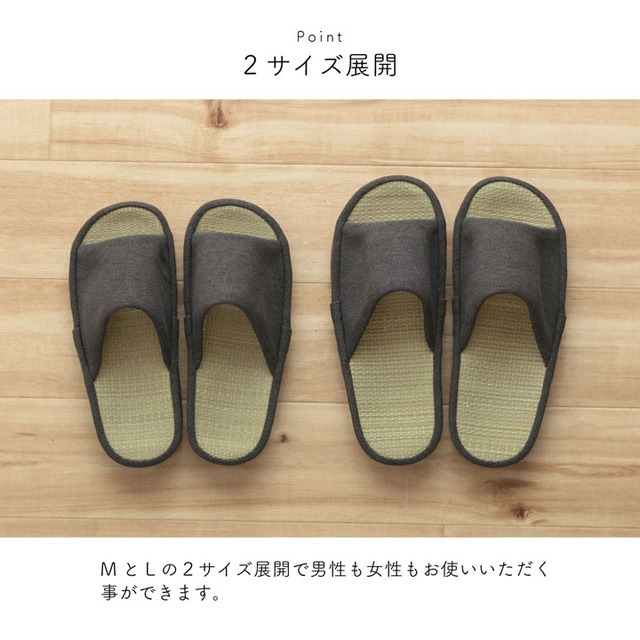 つま先がオープントゥタイプのスリッパです。インソール部分がい草なので、さらっとした履き心地。また、い草の消臭効果で気になる臭いも軽減してくれます。シンプルなデザインなのでご自宅でもオフィスでもご使用頂けます。