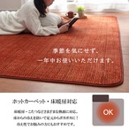 無地系のシンプルデザインです。表地は針抜きでポコポコとした凹凸を出し、なめらかな肌触りの珊瑚マイヤーを使用しています。裏面には滑りにくい加工を施しています。毛足が短いため、お掃除が簡単です。床暖房・ホットカーペット対応です。オールシーズンお使いいただけます。