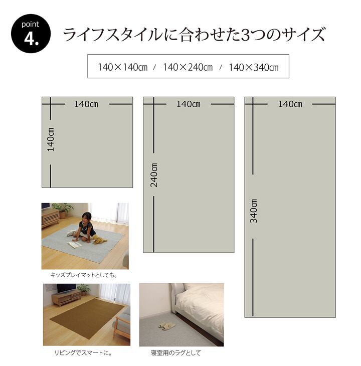 ワンルームから子ども部屋、リビング・ダイニング、ベッドサイド、ソファー前にもマルチに使えるロングサイズのラグです。現在、新築のLDKの広さは20畳以上で、割合はリビングが約10畳、ダイニングが約5畳、キッチンが約5畳となっています。リビング10畳相当では約425×340cm(団地間)になります。間取りは様々ですが、リビングで快適に家族と過ごすことを前提に間取りを決定されているようです。このような住宅環境の変化の中で、大きいサイズをお買い求め頂くことが増えております。一般的な6畳サイズは255×340cmでゆったり使えるサイズになります。しかし、せっかくのフローリングを活かしたい方や少し大きいと思われる方には140cmという幅がとても使いやすいものとなるはずです。より手軽に、スマートに使えるをコンセプトに雰囲気に合わせてご使用頂けるカーペットなのです。一例ですが、一般的なソファーの3人掛けの幅は190〜200cmです。そこに240cmの長さのラグを敷くとピッタリでお部屋のアクセントとしてご使用頂けます。ロングサイズのラグは、その多くの場面で活躍します。裏にはフローリングを傷つけにくいよう不織布を貼っています。また、すべりにくい加工も施していますので、部屋を走り回るのが大好きなお子様やペットがいるご家庭にも安心してご使用頂けます。