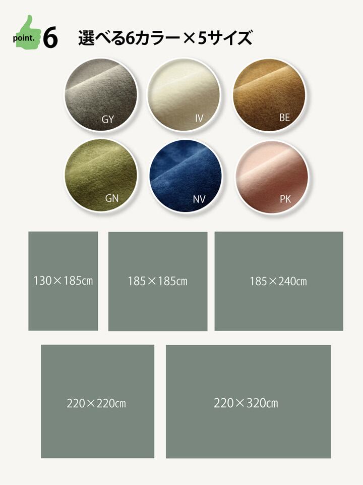 いままでのラグのご不満を解消すべくつくった、使いやすさにこだわったラグです。多色展開ですのでお部屋に合わせてお好きな色をお選び下さい。ラグの不満を解消できる10個のポイント①ソフトな肌触り。表地には短毛のマイクロファイバー(超極細繊維)を使用していますので、ソフトな肌触りです。②ヘタリにくい。目付は1平方メートルあたり240gで、密度が高くヘタリにくい仕様です。③オールシーズン使える。ホットカーペット、床暖房対応です。サラリとしていますので、べとつかず暑い時期にもご使用頂けます。④ホコリが取れやすい。毛足が短いので掃除機もかけやすく、毛足にゴミが絡みにくい。マクロファーバーは遊び毛がでにくいという特長も持っています。⑤つまづきにくい。厚み約4〜5mmで段差が少ないのでお子様やお年寄りにも安心です。⑥すべりにくい。普段見えない裏部分にもこだわりました。フローリングを傷つけにくいよう裏には不織布を貼っています。また、すべりにくい加工を施していますので、部屋を走り回るのが大好きなお子様やペットがいるご家庭にも安心てご使用頂けます。⑦軽量で持ち運び楽々。⑧洗濯機で洗える(洗濯ネット使用)。ご家庭の洗濯機で洗えるウォッシャブル仕様です。軽量なので干しやすいです。⑨インテリア性へのこだわり。ヘリ部分はヘムをまかずにオーバーロック加工で仕上げました。お部屋に敷いて頂いた際の見た目にもこだわりました。⑩コンパクト収納。薄手なので小さく折りたたむことができます。収納時にも場所をとりません。