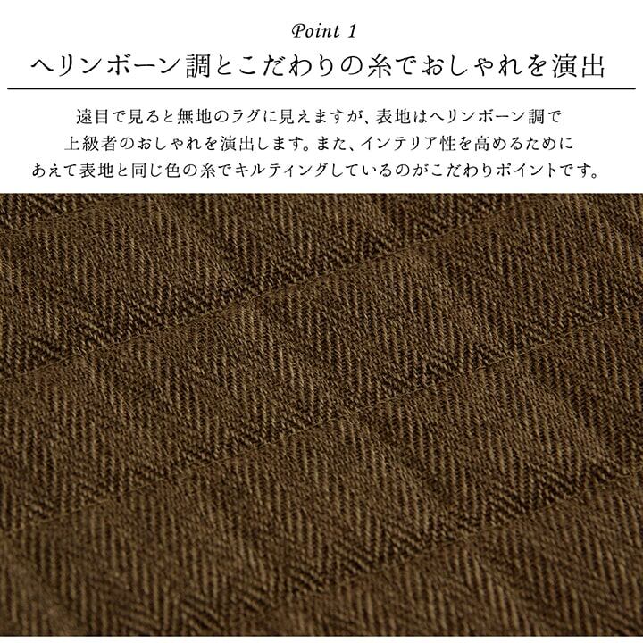 スタイリッシュな無地のキルティングラグカーペットです。キルティング加工をすることで、中わたが寄ったりズレたりしにくく、立体感とボリューム感が出ます。表地に若干の光沢をプラスすることで、シンプルなのにおしゃれで高級感のある雰囲気に仕上げました、また、サラッとした肌触りの生地を使用していますので、季節を選ばず年間ご使用頂けます。中材にはウレタン5mmを使用していますので、適度なクッション性があります。ホットカーペットカバーとしてもご使用頂けます。ご家庭の洗濯機で洗える(ネット使用)ので清潔にご使用頂けます。※滑りやすい床面等でご使用される際には、市販の滑り止めを敷いて下さい。