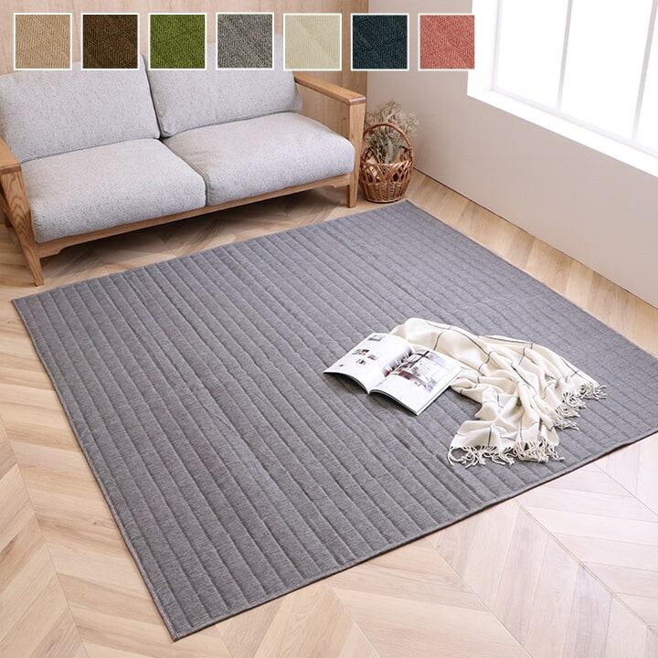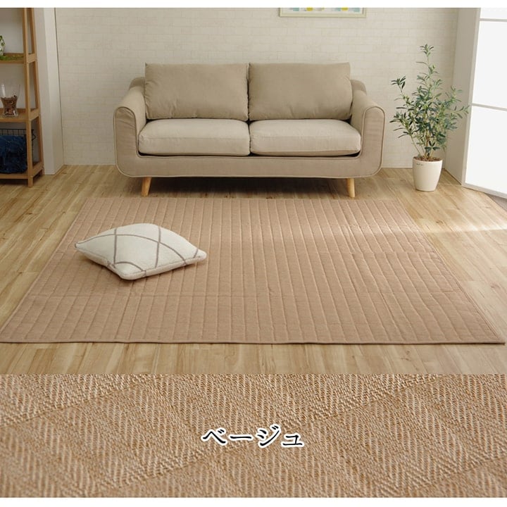 スタイリッシュな無地のキルティングラグカーペットです。キルティング加工をすることで、中わたが寄ったりズレたりしにくく、立体感とボリューム感が出ます。表地に若干の光沢をプラスすることで、シンプルなのにおしゃれで高級感のある雰囲気に仕上げました、また、サラッとした肌触りの生地を使用していますので、季節を選ばず年間ご使用頂けます。中材にはウレタン5mmを使用していますので、適度なクッション性があります。ホットカーペットカバーとしてもご使用頂けます。ご家庭の洗濯機で洗える(ネット使用)ので清潔にご使用頂けます。※滑りやすい床面等でご使用される際には、市販の滑り止めを敷いて下さい。