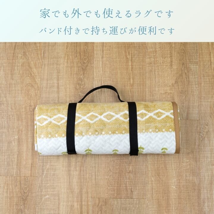 一年中、家でも外でも使うことができる防水ラグです。バンド付きですので持ち運びに便利です。