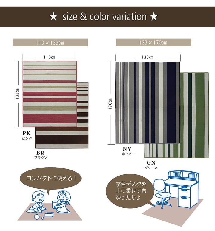 デザインもシンプルなボーダー柄で使いやすく、大人のテレワーク用デスクの下にも敷けます。