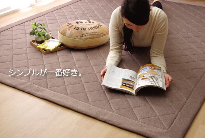 デニム調のキルティングラグカーペットです。キルティング加工をすることで、中わたが寄ったりズレたりしにくくなります。表地にはしなやかで伸縮性のある生地を使用しています。とても柔らかくソフトな風合いです。中材には固わたを使用しており、適度なクッション性があります。フローリングを傷つけにくいよう、裏には不織布を貼っています。またすべりにくい加工も施しておりますのでフローリングでも安心してご使用頂けます。ホットカーペットカバーとしてもご使用頂けます。床暖房にも対応可です。季節を選ばすオールシーズンご使用頂けます。