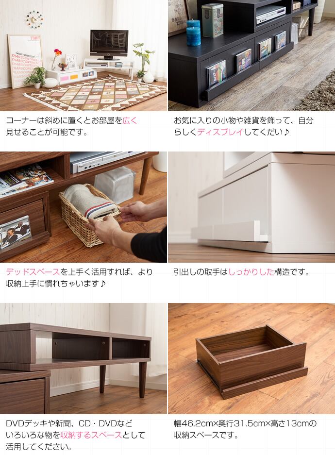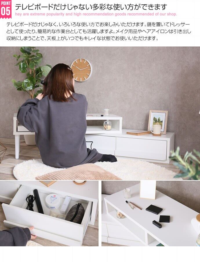 伸縮・回転してレイアウト自在のテレビボード!引出しが2杯ついて収納力もたっぷり!テレビボードやPCデスクとしてもご利用いただけます!当店一番人気のロングセラーのテレビボードです。サイズ (本体)幅112〜202×奥行39×高さ40cm/(上棚オープン部)幅48.7×奥行39×高さ11cm(引出内寸)幅43×奥行29.5×高さ13cm 有効収納内寸14.5cm/(脚部)高さ24cm素材 パーチクルボード(メラミン貼り)注意事項 2〜5日営業日以内の発送予定となります。午前・午後のお届け時間のご指定が可能です。備考 耐荷重【上天板】約20kg【下天板】約30kg【各上段棚】約10kg【各引出し】約4kg商品重量:約42.6kg梱包サイズ:約110×44×22cm梱包重量:約44.8kg※テレビは最大50インチ程度を置いていただけますが、テレビのサイズによっては置けないこともございますので、サイズをご確認の上ご購入下さい。※左右の組み替えも可能です。背面化粧処理済み※プラスドライバーをご用意ください※組立時間:2人以上で約50分