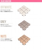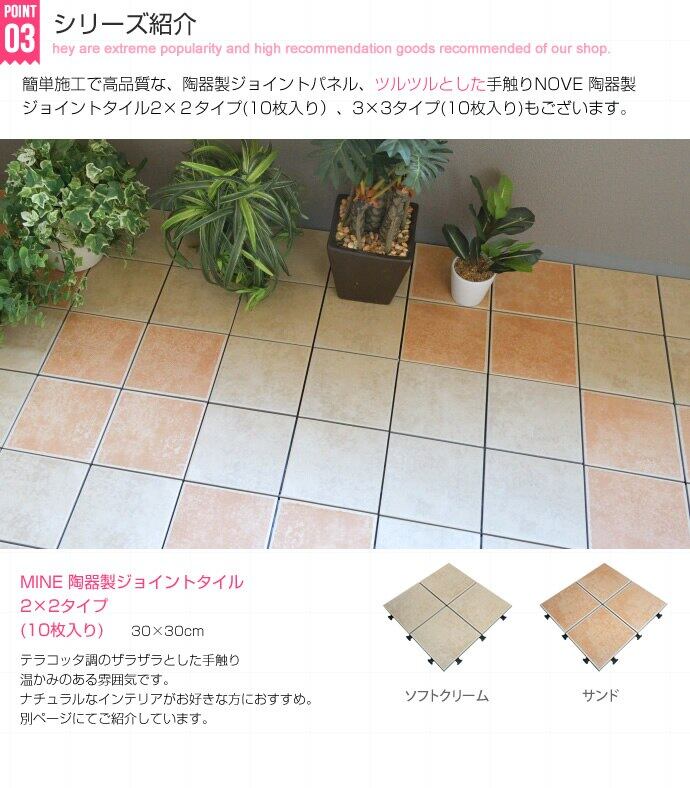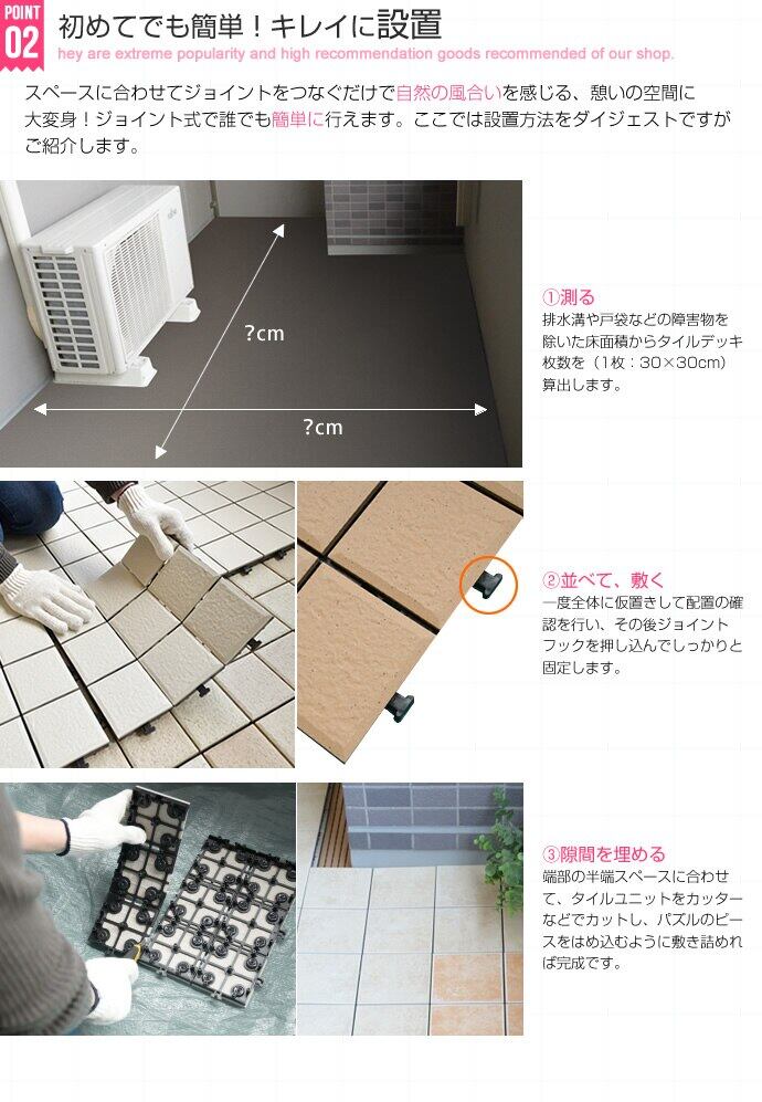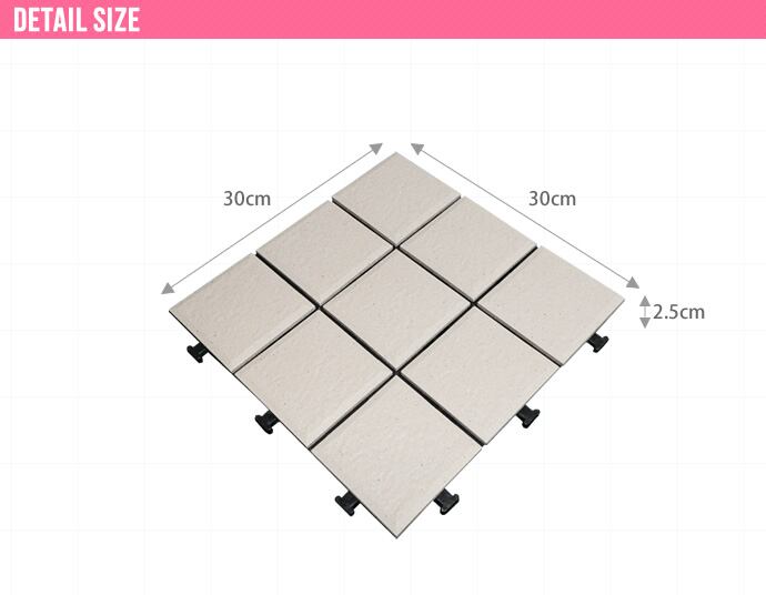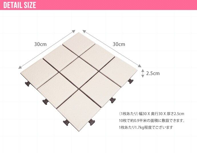 便利なジョイントパネル。ジョイント式だから、パズルのようにはめ込むだけで、誰でも簡単にベランダリフォームが可能です。殺風景なベランダも、ジョイントパネルで美しいタイル張りのセンスあるオープンエアに変身します。サイズ (1枚あたり)幅30 X 奥行き30 X 厚さ2.5cm10枚で約0.9平米の面積に敷設できます。1枚あたり1.7kg程度でございます。素材 上部/陶器タイルベース部/ポリエチレン・EVA樹脂【質感】タイルはスベスベした質感になります注意事項 【組立品】商品発送後、配送会社よりお届け日時の調整・確認の意向で「お届け先電話番号」へご連絡を差上げる場合がございます。備考 【梱包サイズ】32cm×32cm×26.5cm【ご注意】※玄関先までのお届けとなります。※こちらはお客様にて敷設をしていただく商品です。※表面は焼成タイルですので焼き具合によってそれぞれの模様や色合いが微妙に異なります。予めご了承くださいませ。※日光に照らし続けると、タイル表面がコンクリートのように熱くなる場合がございます。 気温が高い日は十分にご注意くださいますようお願い申し上げます。※サイズ・色やベランダの広さをよくお確かめの上、ご注文ください。※ご購入後・設置後に余ったなどお客様のご都合による、ご返品は承ることはできませんので敷き詰め予定の広さ等十分に確認の上、ご注意くださいませ。