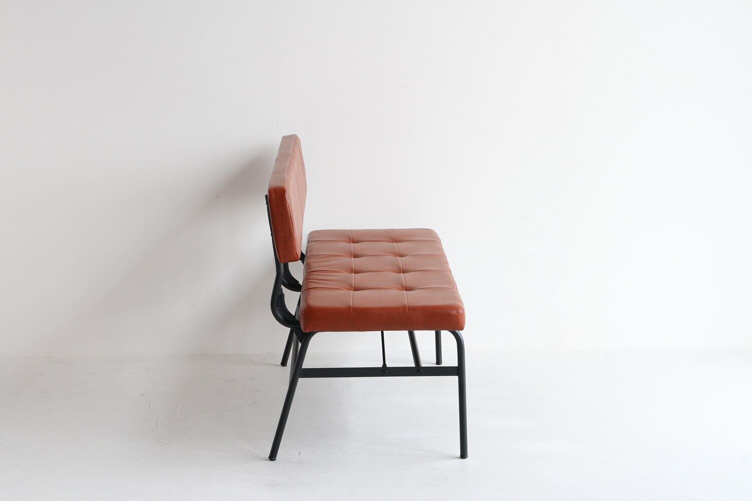 PVCとスチールを組み合せた背もたれ付きベンチ。赤みがかったブラウンがカフェ風の空間を演出。ダイニングテーブルに合わせたり、玄関ベンチやリビングベンチとしても活躍してくれます。別売りのパーツを付けるとアームベンチとしても使用可能。