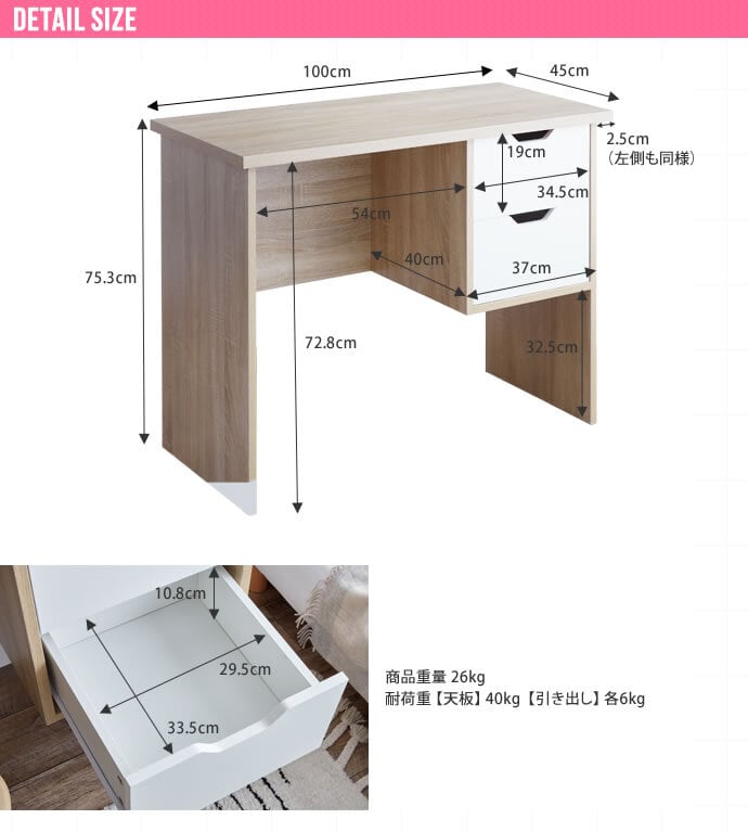 サイズ 幅100cm×奥行45cm×高さ75.3cm 素材 パーティクルボード(メラミン化粧貼り) 注意事項 【組立品】1〜4日営業日以内の発送予定となります。午前・午後・夜間のお届け時間のご指定が可能です。 備考 【梱包サイズ】110cm×53cm×18cm 【商品重量】約26kg 【耐荷重】天板:40kg、引き出し:6kg(1杯あたり) ※組み立て時間:約45分 ※プラスドライバーをご用意ください。 【ORG】 配送・仕様 ▼沖縄・北海道・離島への配送は別途配送料が必要になる場合がございます 離島に関しましては、追加で別途中継費用が必要になる場合がございます。 ▼商品の仕様やデザインは、品質に問題がない程度に予告なく変更させていただく場合がございます 商品の仕様やデザインは随時改善をしており、入荷のタイミングによってはデザインが変更されている場合がございます。 何度も同じ商品をご注文しているお客様はくれぐれもご注意下さい。 部品、生産国、脚部の形状、縫製、カバー類の色や形、サイズなどに少々誤差が発生する場合がございます。 予めご了承を宜しくお願い致します。