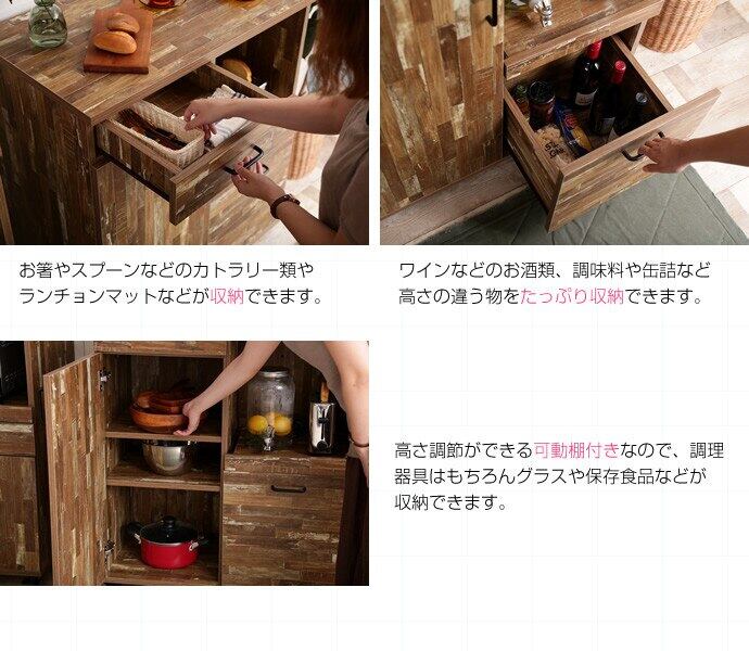寄木柄80cmレンジ台キャスター付き スライド扉 引き出し コンセント キッチン収納