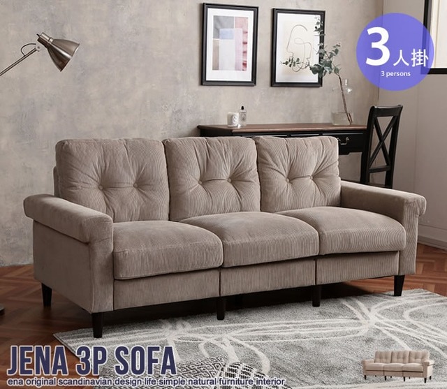 『Jena』3人掛けコーデュロイソファは、シャビーシックなインテリアや北欧風のインテリアなど憧れの海外風インテリアに合わせやすいデザインのソファです。ふかふかのクッションで肌ざわりが良く、お部屋全体を優しい雰囲気にしてくれます。脚部は簡単に取り外しできるので、雰囲気に合わせて高さを変える事もできます。ワイドサイズなので広々とした奥行きがあり、ゆったりとくつろぐことができますよ♪サイズ 幅185cm×奥行74cm×高さ80cm素材 Sバネ、ウレタン、ファブリック注意事項 【組立品】2〜5日営業日以内の発送予定となります。午前・午後のお届け時間のご指定が可能です。※ カバーは、色落ちの恐れ、生地が縮む場合がございますので洗濯はできません。備考 【梱包サイズ】幅155cm×奥行65cm×高さ63cm【商品重量】35kg【耐荷重】300kg