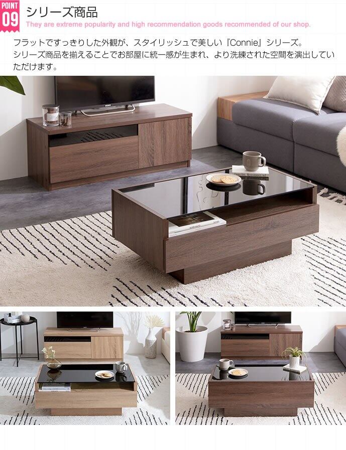 シンプルですっきりした見た目と、豊富な収納力を兼ね揃えた『Connie(コニー)』のガラス天板センターテーブル