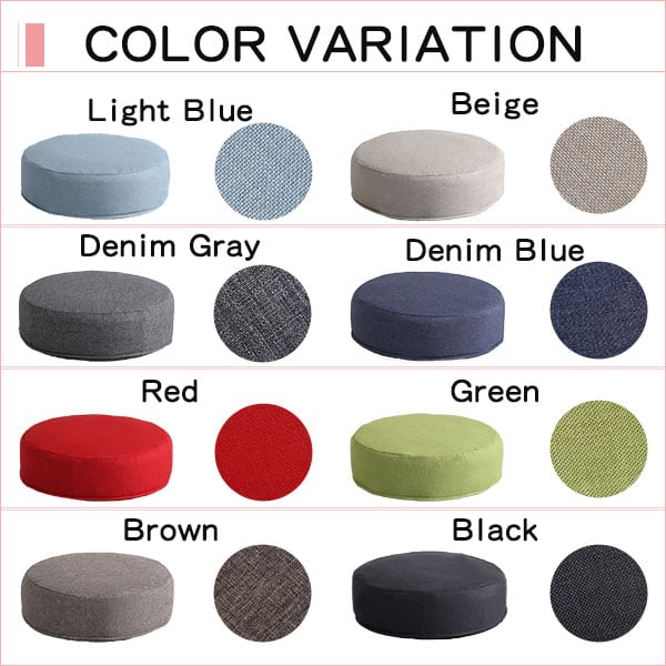 ライトブルー(LBL)、ベージュ(BE)、デニムグレー(GY)、デニムブルー(BL)、レッド(RD)、グリーン(GE)、ブラウン(BR)、ブラック(BK)