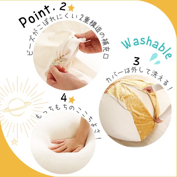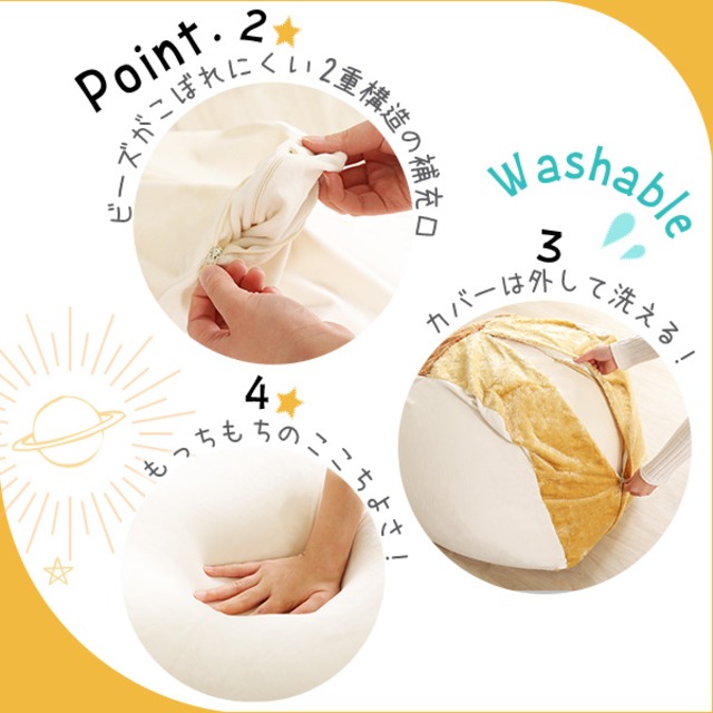 中材:発泡ポリスチレンビーズ 収縮する生地:ポリエステル88% ポリウレタン12%