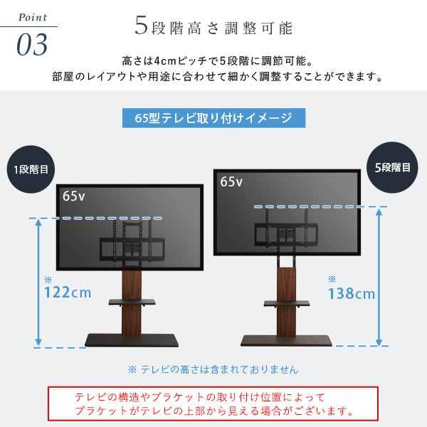 テレビの位置は5段階調整ができますので、お好みの高さに設置できます。