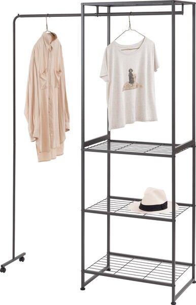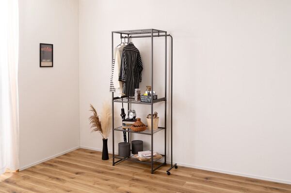 ●伸縮可能なハンガー機能付きのスチールラック●シンプルで、置く場所を選ばないスチール製のラック。伸縮機能が付いたハンガーが付いており、衣類を掛ける量やお部屋の広さに合わせて、ハンガーの幅を調整する事が出来ます。●ラックの脚はアジャスター付きでガタつきを防止します●ハンガーの脚はキャスター付きで伸縮をスムーズにしてくれます●ワンタッチで簡単伸縮●ずり落ち防止のストッパー
