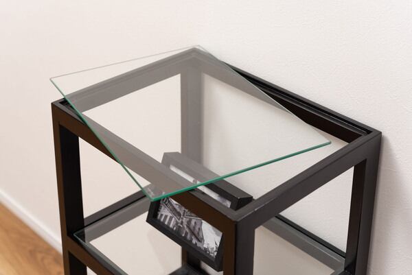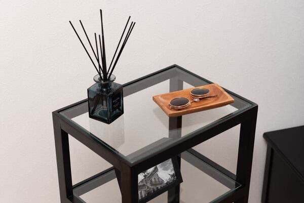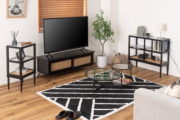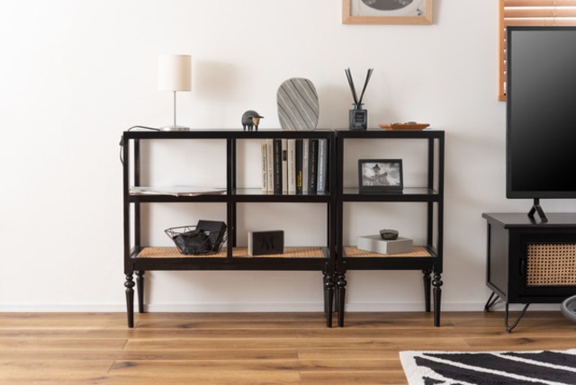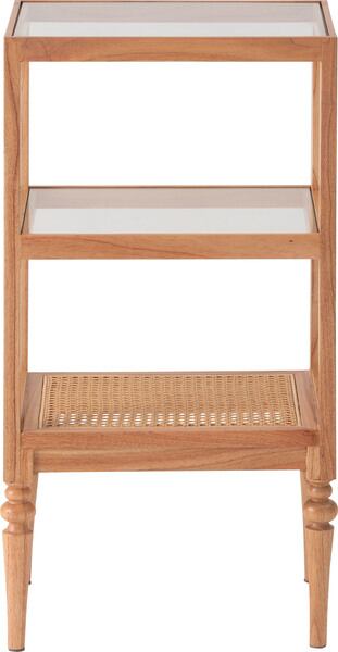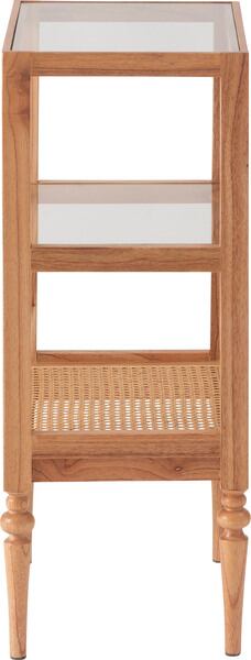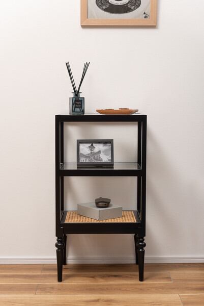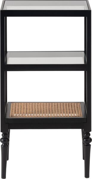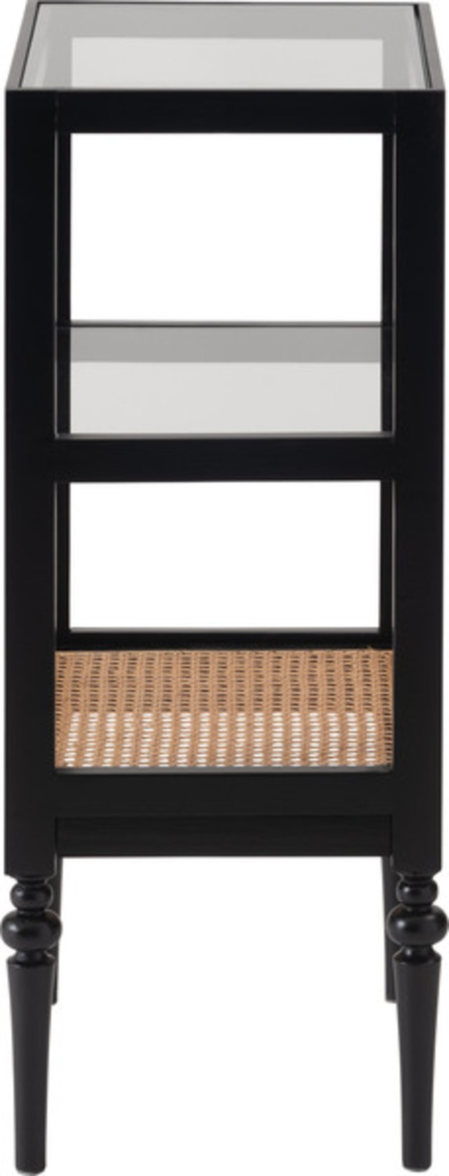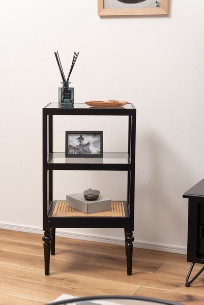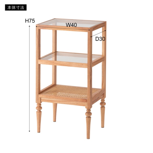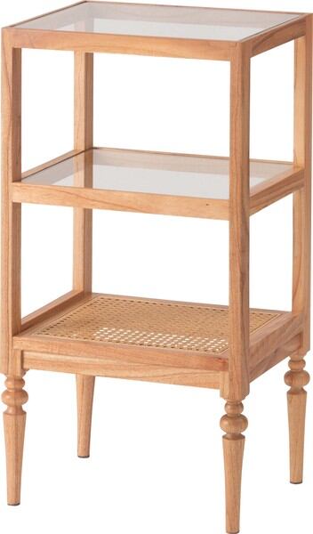 検索ワード:収納 棚 シェルフ オープンシェルフ オープン収納 3段 三段 見せる収納 魅せる収納 木製 天然木 ミンディ ラタン 籐 幅40cm 高さ75cm ガラス クリア 透明 ターンドレッグ ろくろ脚 シック クラシック モダン ブラック 黒