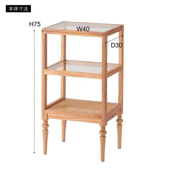 オープンシェルフ 収納 棚 シェルフ オープン収納 3段 三段 見せる収納 魅せる収納 木製 天然木 ミンディ ラタン 籐 幅40cm 高さ75cm ガラス クリア 透明 ターンドレッグ ろくろ脚 シック クラシック モダン ブラック ナチュラル 黒 リビング ショップ 店舗 カフェ