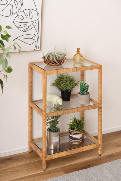 検索ワード:シェルフ ガラス ガラスシェルフ ラタン 籐 クリア 収納 収納棚 ラック オープンラック 3段 三段 見せる収納 シンプル 北欧 ナチュラル ナイトテーブル 強化ガラス