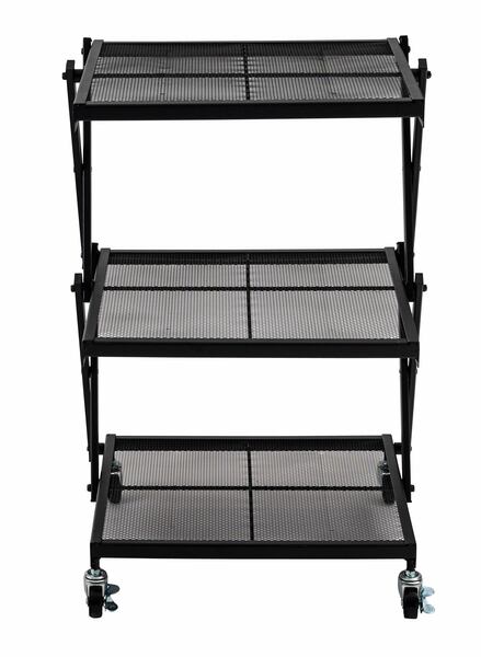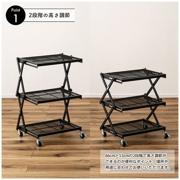 検索ワード:ラック 折りたたみ 折りたたみラック キャスター ストッパー付き 高さ調整 3段 スチール アイアン シンプル モダン ブラック 黒